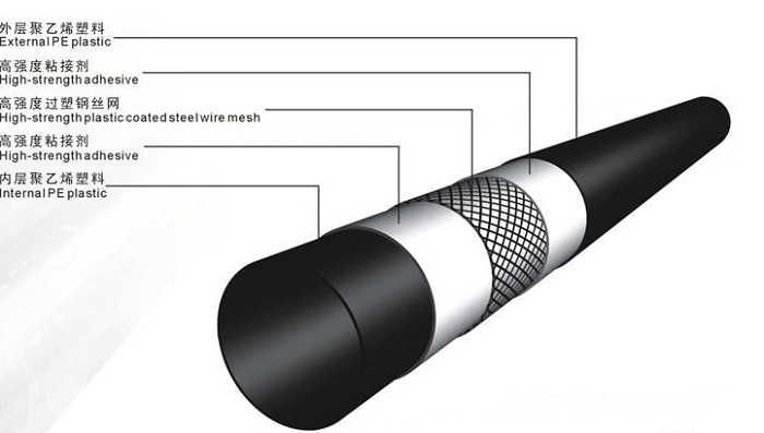 1.钢丝网骨架通过专用热熔胶层复合在塑料之中,管材内外表面具有相同防腐性能,耐磨,内壁光滑输送阻力小,不结垢,不结蜡,节能效果明显,用于埋地输送及有腐蚀性环境条件下更加经济方便。